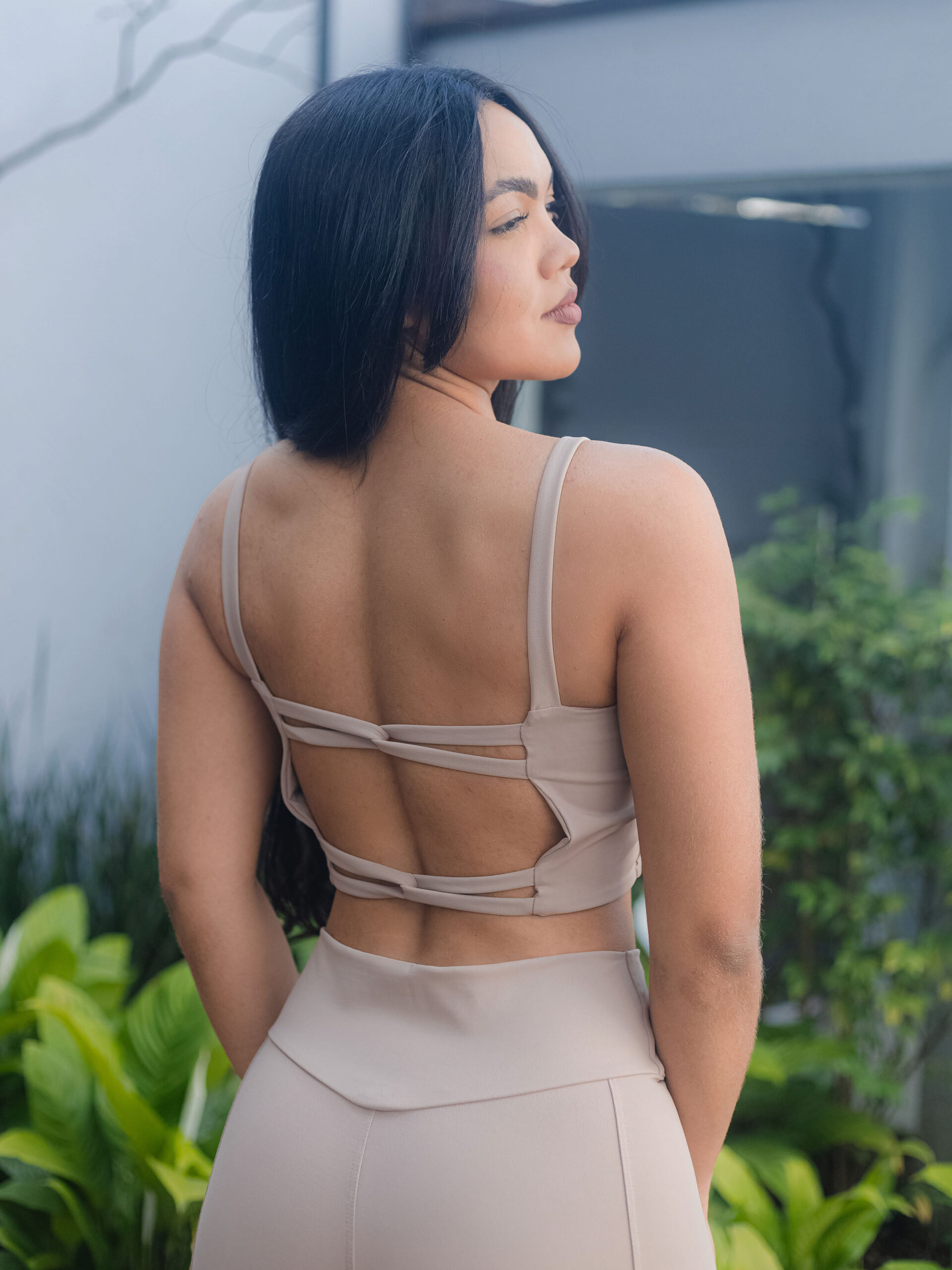 O destaque fica por conta do design exclusivo nas costas, com tiras delicadas que adicionam um toque moderno e feminino ao look.