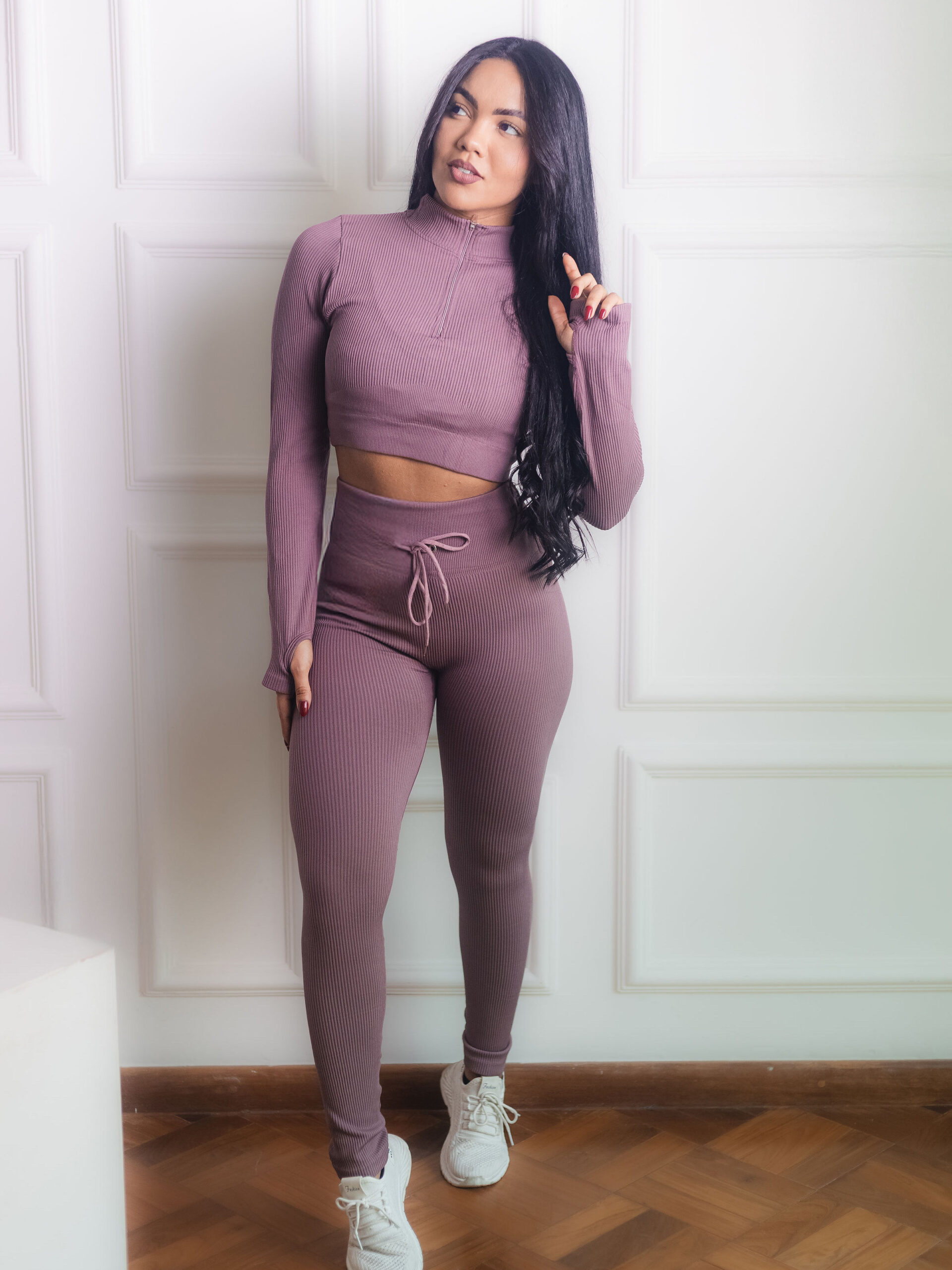 Conjunto confeccionado em tecido canelado de alta elasticidade, que se ajusta ao corpo com conforto e firmeza. A blusa cropped possui zíper frontal e recorte moderno, garantindo estilo e praticidade. A calça legging traz cintura alta com amarração, valorizando a silhueta e proporcionando ajuste perfeito. Ideal para o dia a dia, viagens ou treinos leves com muito estilo.