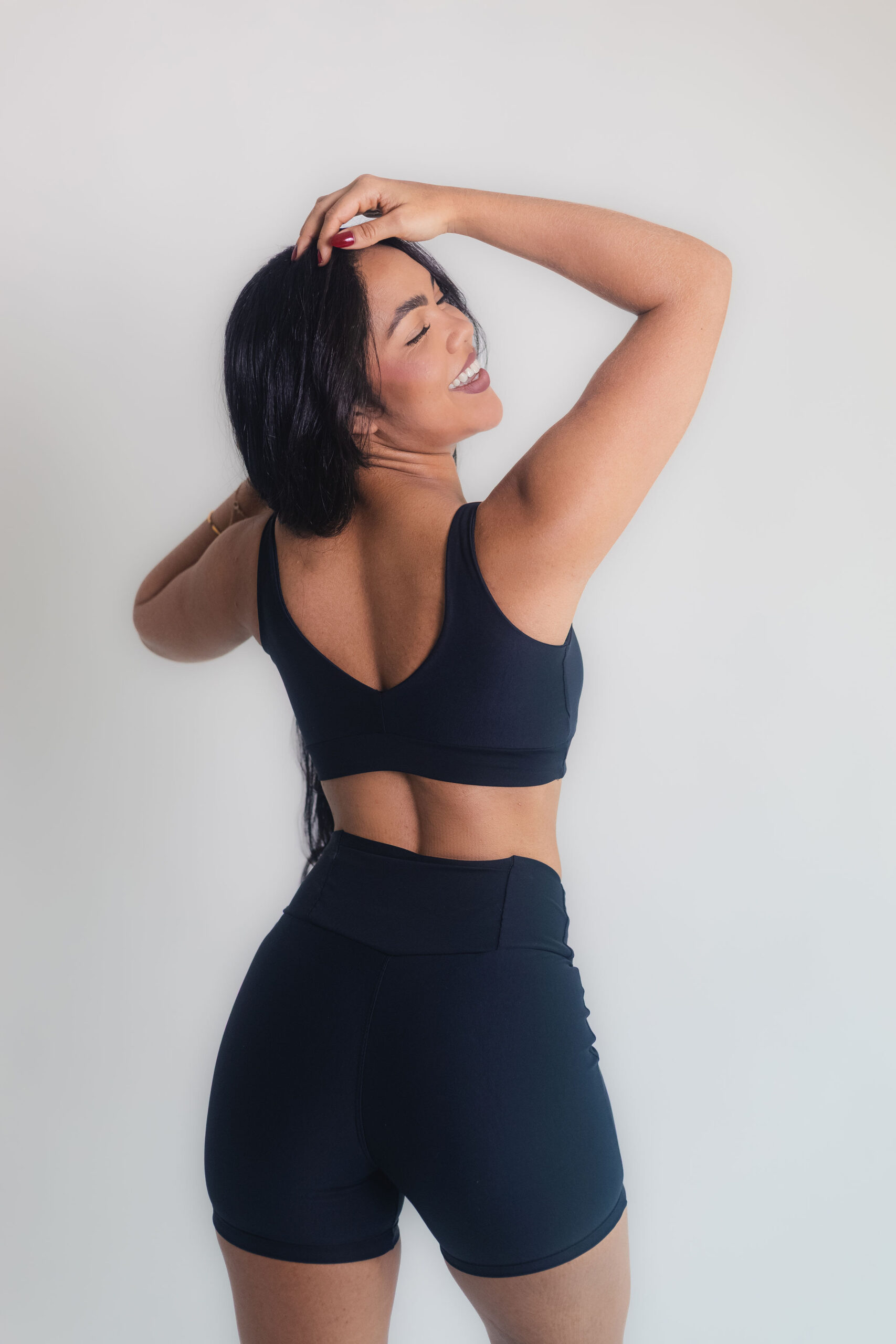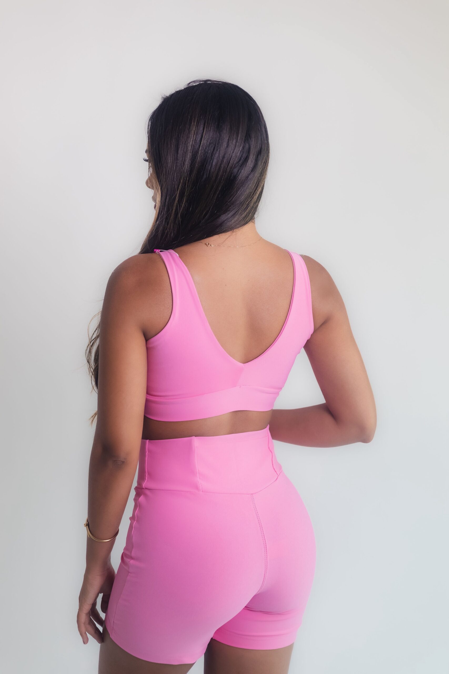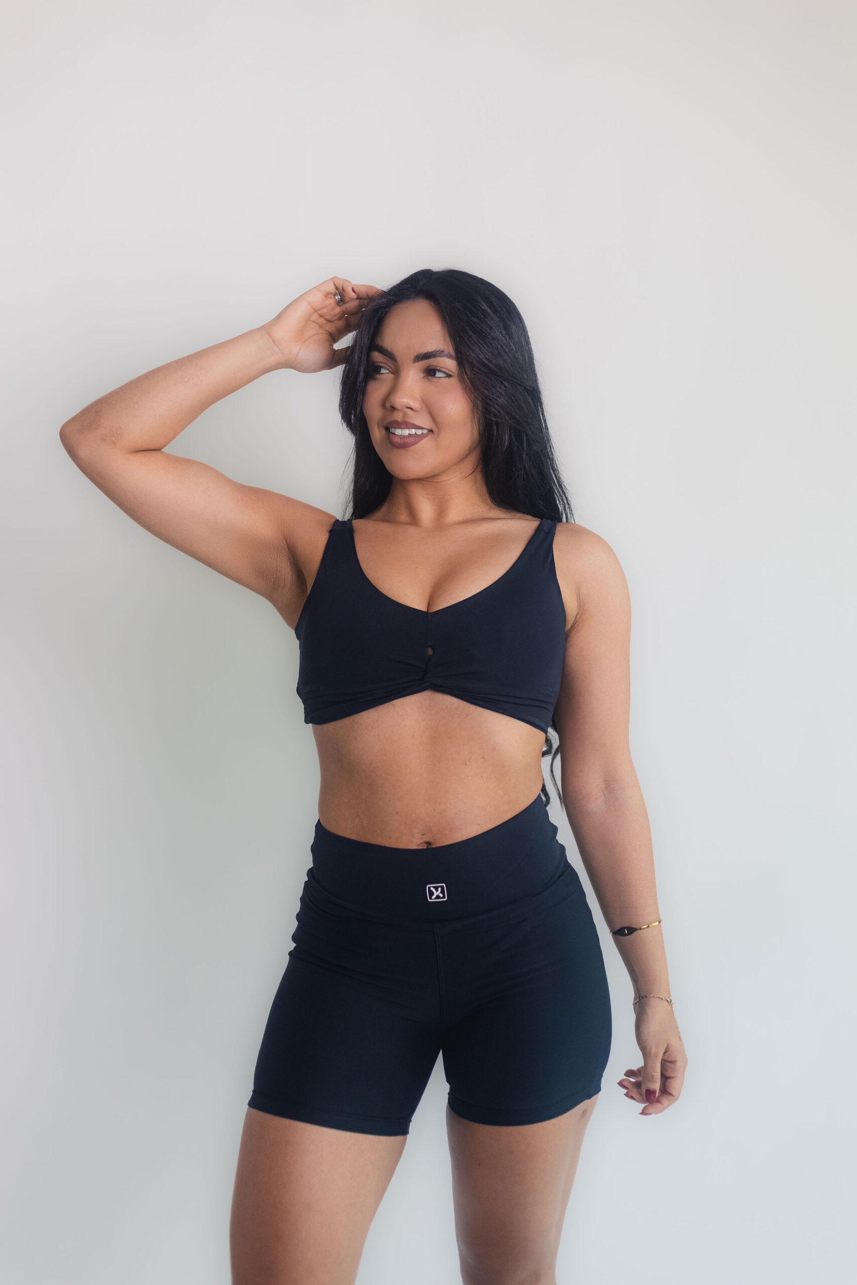 Conjunto confeccionado em poliamida com toque macio e excelente elasticidade. O top possui franzido frontal com recorte discreto, valorizando o busto com estilo e sustentação. O short cintura alta modela a silhueta e garante liberdade de movimento, ideal para treinos ou composições casuais.