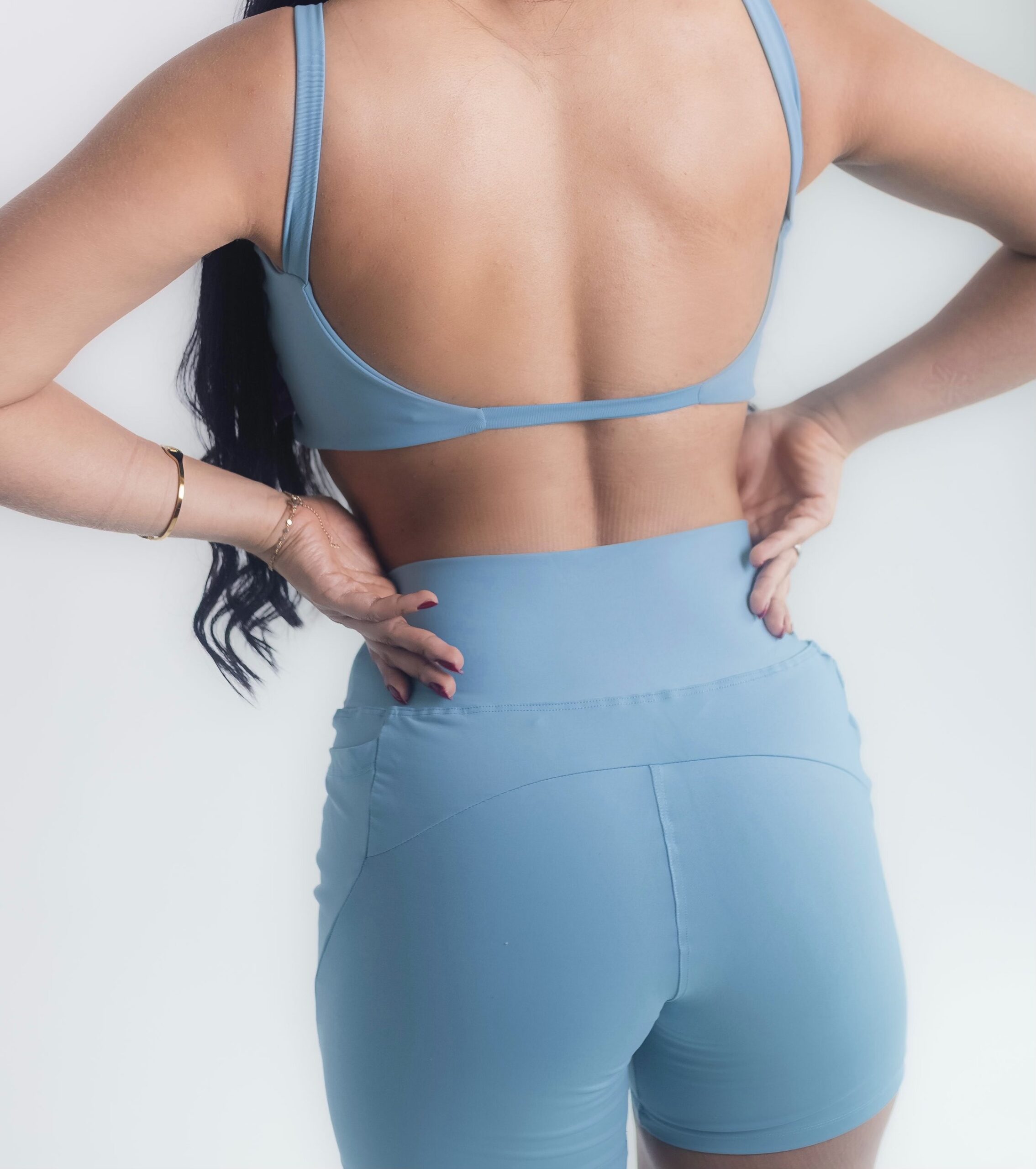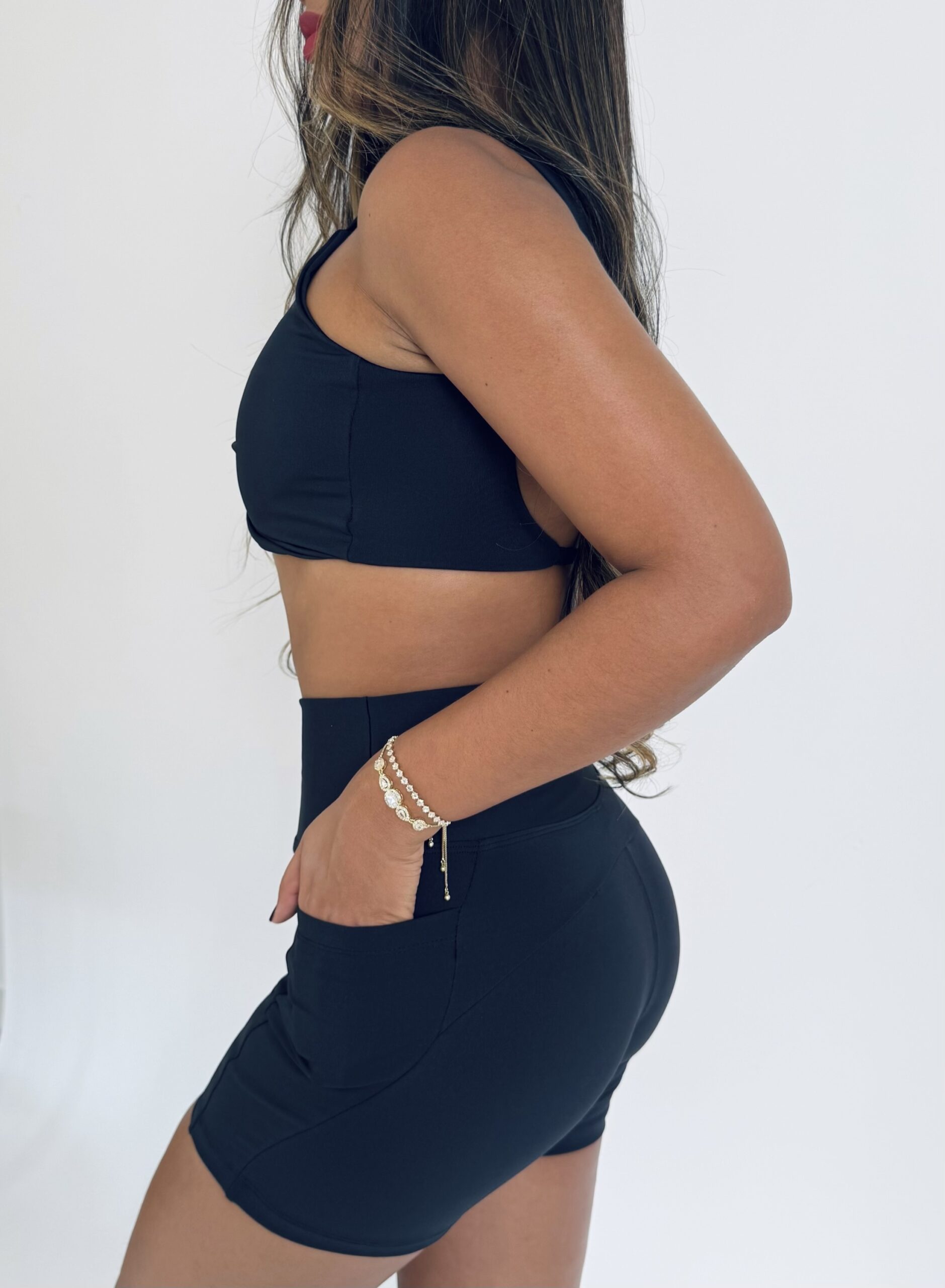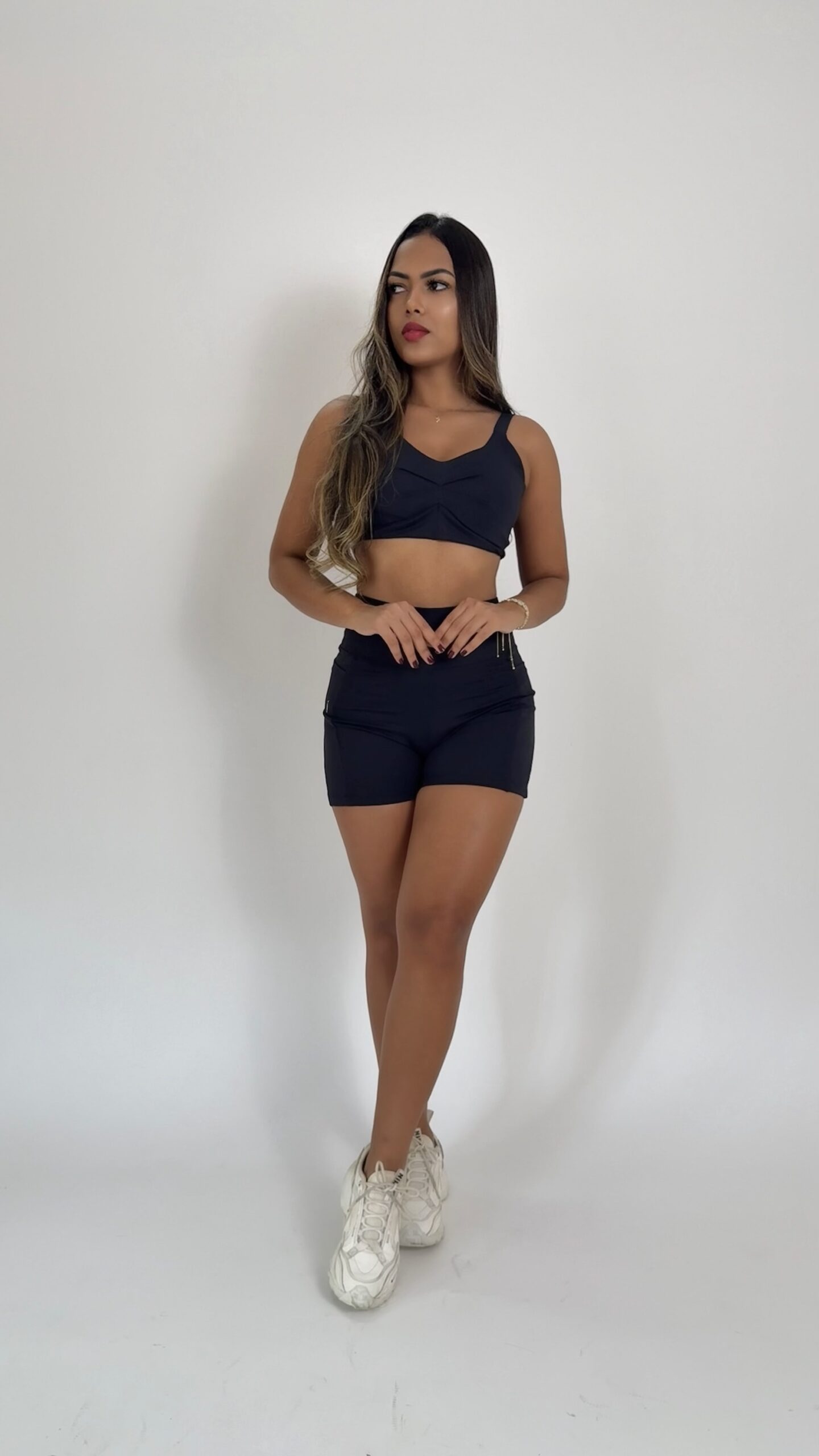 Seu top com torção frontal valoriza o busto com delicadeza, enquanto o short cintura alta traz segurança e equilíbrio ao look.