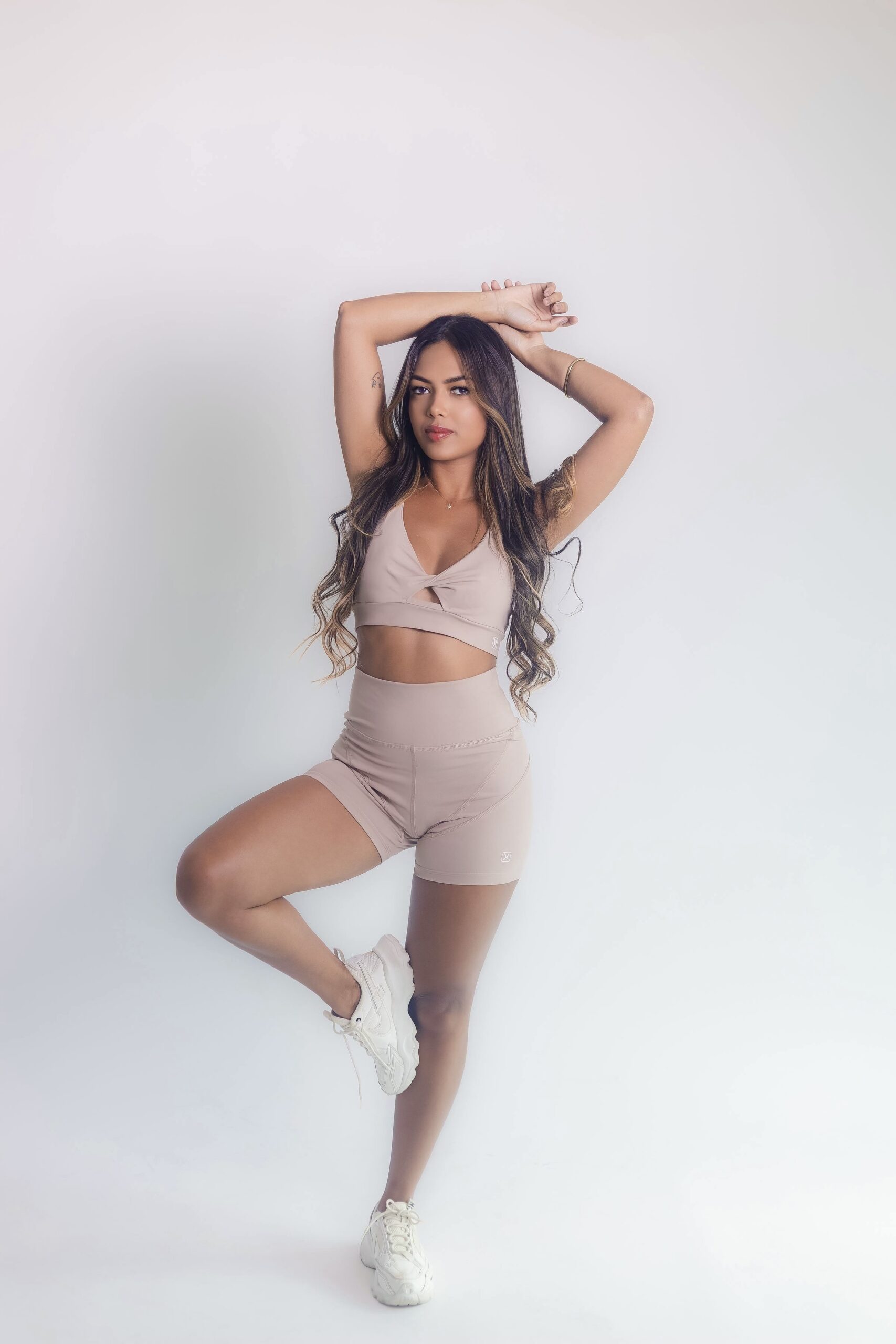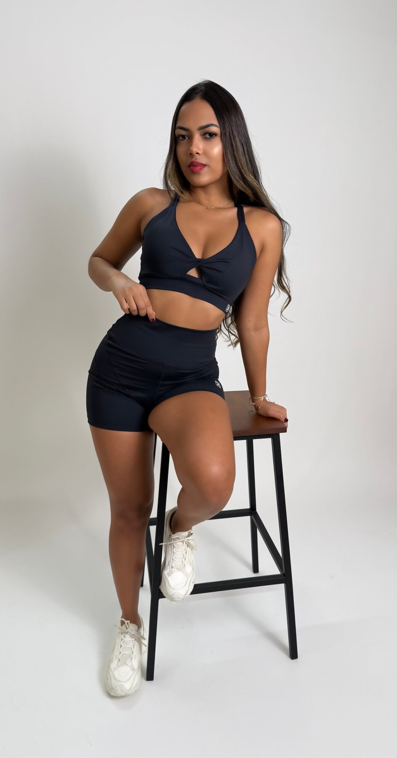 O equilíbrio perfeito entre conforto e estilo. O conjunto Sofia é confeccionado em poliamida premium, tecido tecnológico que oferece compressão ideal e toque suave na pele. O top torcido com recorte frontal valoriza o busto e garante sustentação com charme, enquanto o short modelador de cintura alta proporciona firmeza e liberdade em cada movimento.